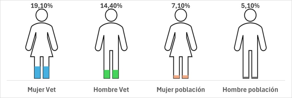 Depresión y ansiedad: La combinación de agotamiento emocional, estrés continuo y la presión para tomar decisiones difíciles afecta el bienestar psicológico de los veterinarios. Estudios han demostrado que las tasas de depresión y ansiedad entre los veterinarios son significativamente más altas que en la población general (figura No.1) (Animal´s Health, 2023; Nett, et al., 2015). La fatiga por compasión agrava estas condiciones, ya que el veterinario está constantemente lidiando con el sufrimiento de sus pacientes y las expectativas emocionales de los tutores.